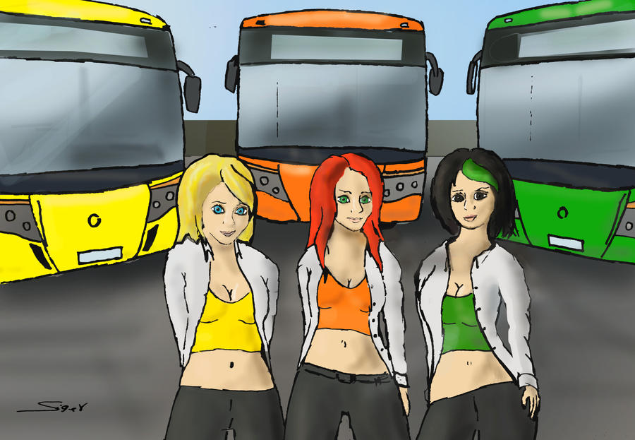 Una representación "artística" del grupo Baixbus, con sus respectivas conductoras y autobuses. ©SigerGray (fuente original: deviantart.com)